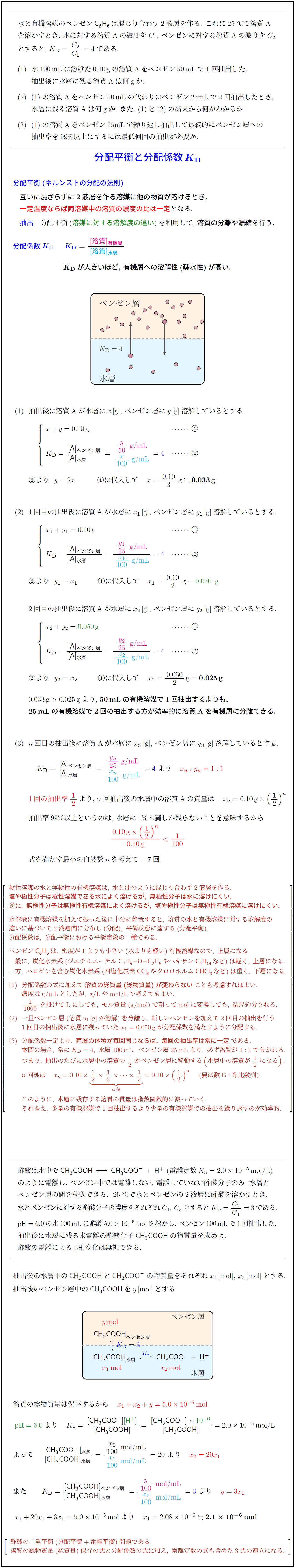 溶質Aの総量を0.10gとし、水層にx g、ベンゼン層にy gが溶けているとする。