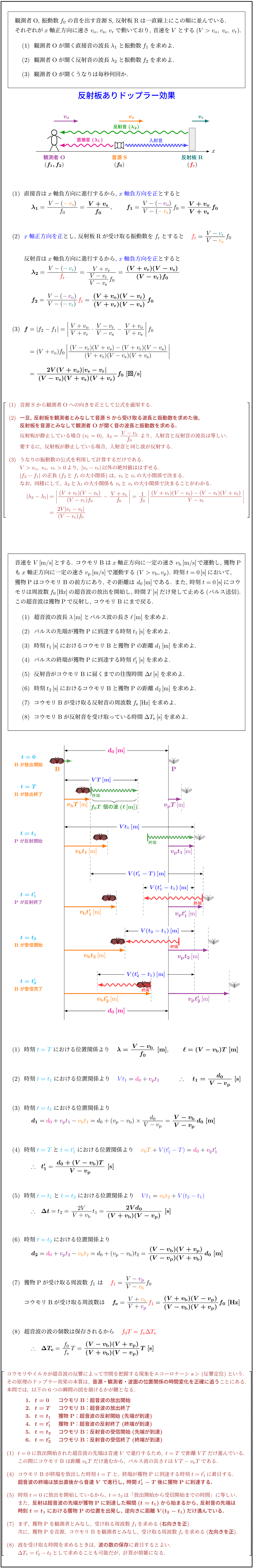 (2) 一旦, 反射板を観測者とみなして音源Sから受け取る波長と振動数を求めた後,