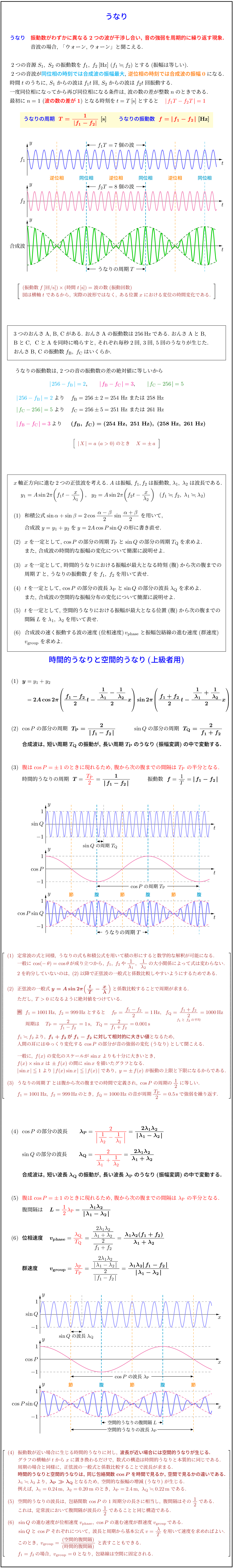 うなりの振動数 f = |f₁ − f₂| [Hz]